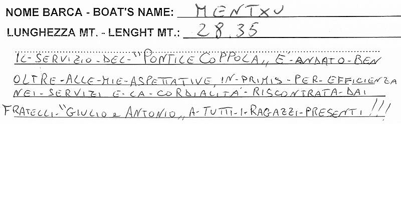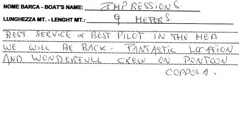 Best service & best pilot in the Med. We will be back. Fantastic location and wonderfull crew on pontoon Coppola.