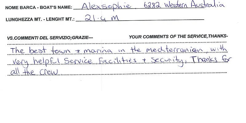 The best town and marina in the mediterranian with very helpful service facilities and security. Thanks for all the crew.