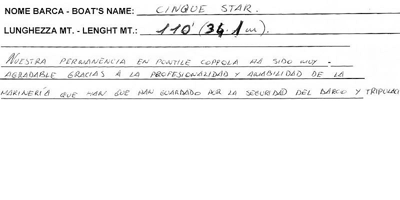 Nuestra permanencia en Pontile Coppola ha sido muy. Agradable gracias a la profesionalidad y anabilidad de la marinerìa que han oue han guardado por la seguridad del barco y tripulaci.